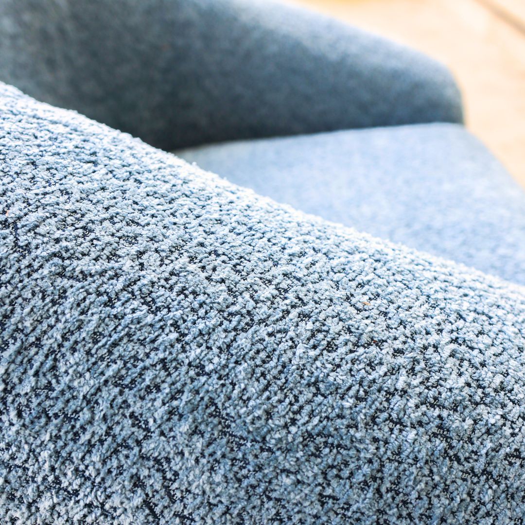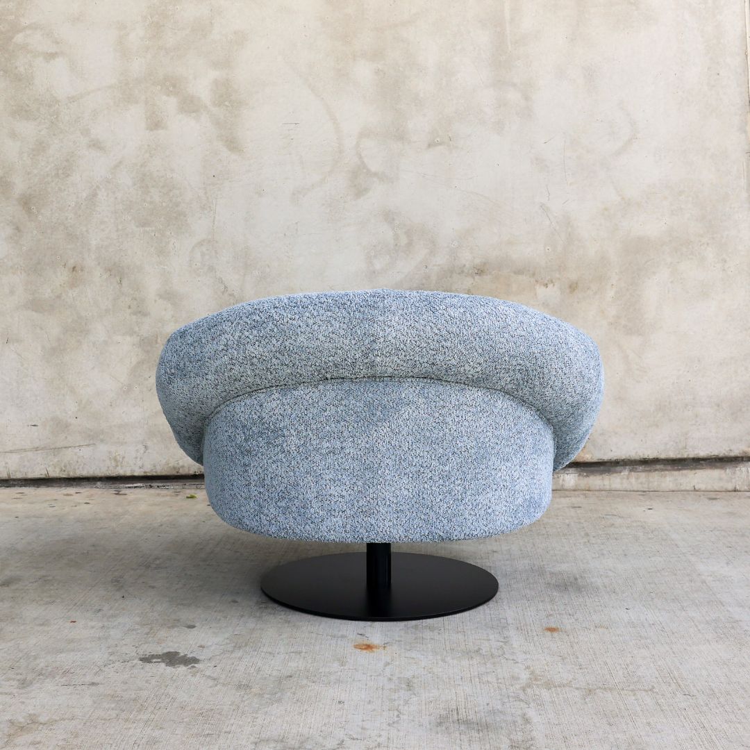 The swivel feature of the chair allows for easy movement while sitting or looking around, adding convenience to its modern aesthetic appeal. The chair is suspended from the floor and floats gracefully in mid-air, giving it an ethereal touch. With a well-textured fabric cover in a pale ocean, it adds a pop of colour to any room it occupies. The contrasting iron black base provides a solid foundation for the chair, complementing its overall design. With its robust design and sturdy construction, it's sure to provide years of comfortable seating enjoyment.